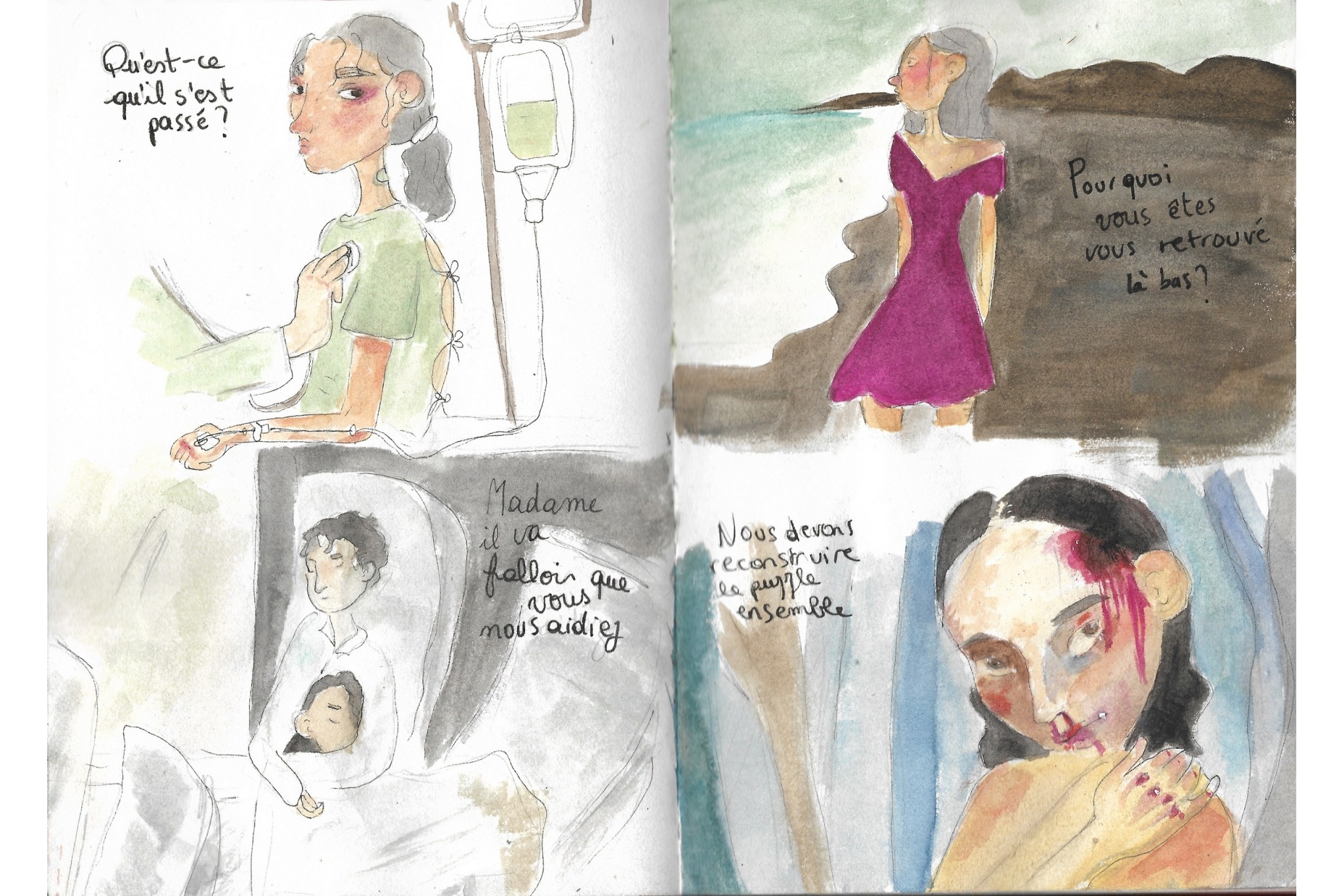 Cette planche est une bande dessinée. J’avais pour but de dépeindre une histoire d’amour qui aurait mal fini. J’avais l’intention que cela donne l’impression d’une bande d’annonce. Avec une voix derrière les images comme: des médecins, policiers ou psychologues qui essaient de reconstruire l’histoire.